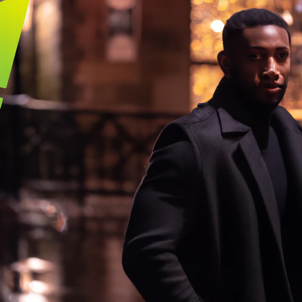 handsome black british man in london at night, stylish black coat over a fitted black outfit, confident posture, subtle smile, glowing street lights and bokeh, wet pavement reflections, cinematic lighting, teal and warm highlights, realistic skin detail, 35mm street portrait, shallow depth of field, high-end movie still, ultra detailed, clean composition, no text, no watermark